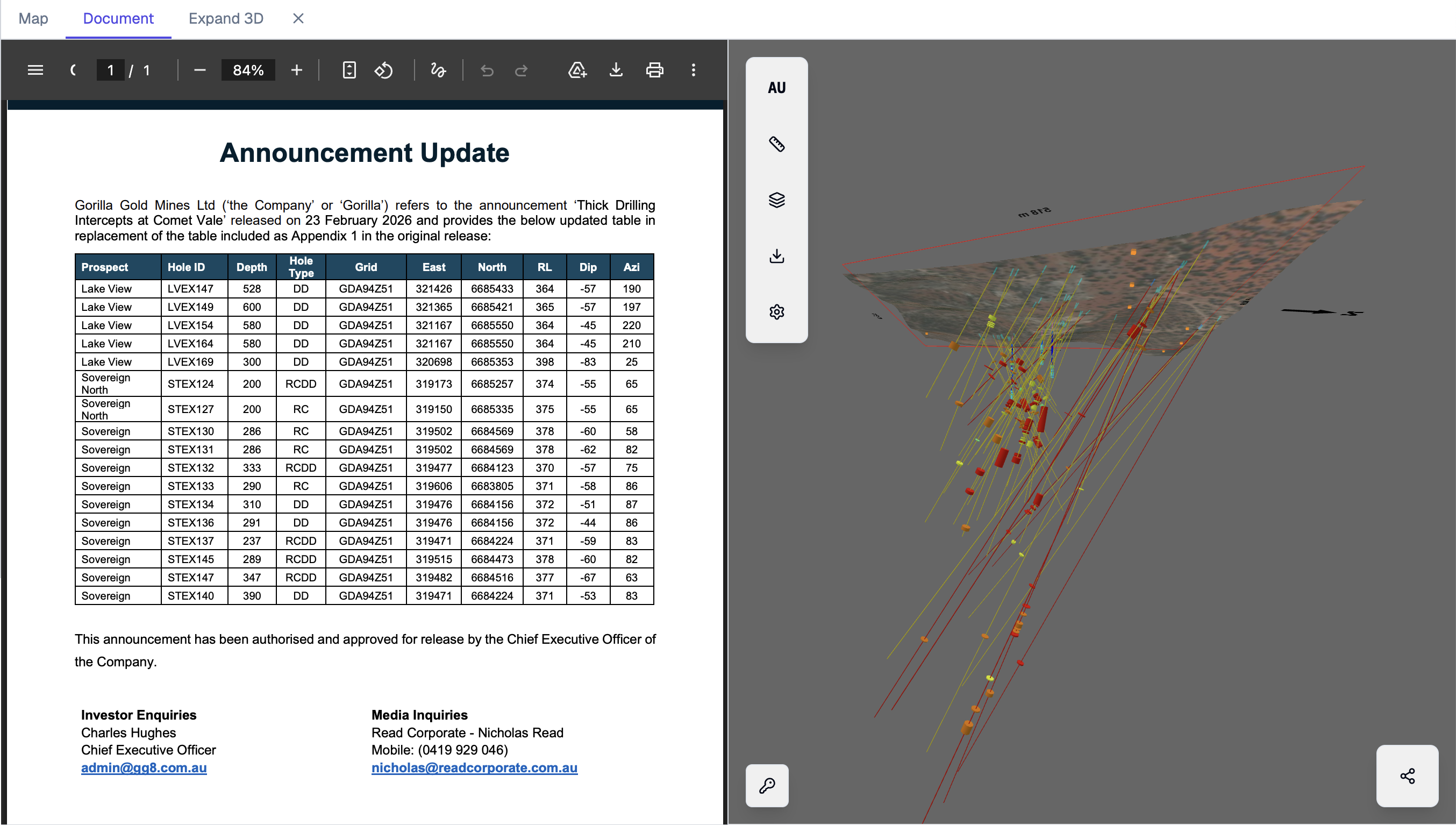 CaneToad processes ASX documents as they are released, turning new disclosures into usable geological context within minutes rather than days. Instead of waiting for someone to manually rebuild a model, users can review fresh results in space alongside historical drilling almost immediately.