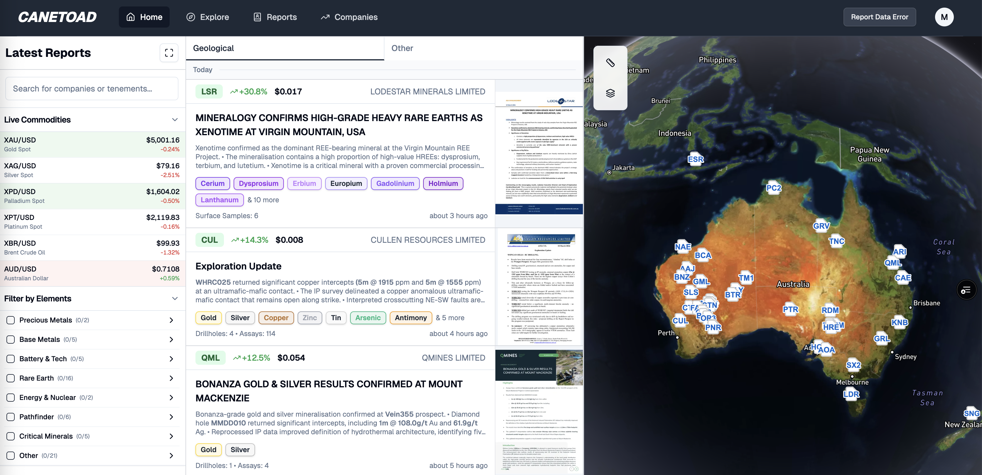 CaneToad brings market data into the same workflow as geological research, with delayed stock prices alongside realtime commodities and forex data. This lets users compare company results against the broader market backdrop without switching between separate finance and exploration tools.
